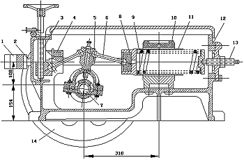 ①、14-大皮帶輪  ②、5-搖動(dòng)桿  ③、9-彈簧  ④、7-偏心軸  ⑤、6-肘板   ⑥、鞍形基腳上搖動(dòng)盒的撐板