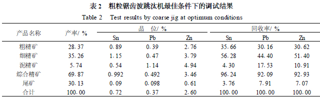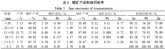 (1)大廠92#礦體礦石20~0mm全粒級入選,鋸齒波跳汰機預(yù)選拋廢率為30.45%,錫、鉛、鋅金屬回收率分別為93.48%、90.38%、90.75%。