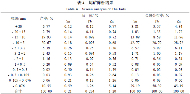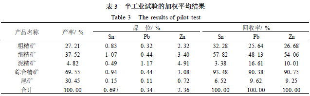 由表2得知,拋廢率為30.13%時,錫、鉛、鋅金屬回收率分別為96.24%、92.09%、92.93%,尾礦品位分別為Sn0.09%、Pb0.098%、Zn0.61%。