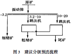 ,因此對鋸齒波跳汰機的尾礦只需進行脫泥作業(yè),就可以將其回收。②尾礦中+3.2-10mm粒級的品位偏高,金屬損失率較高,這說明寬級別分選工藝不甚合理,因此建議采用分級分別預(yù)選工藝,這樣拋廢率和金屬回收率有望進一步得到提高。