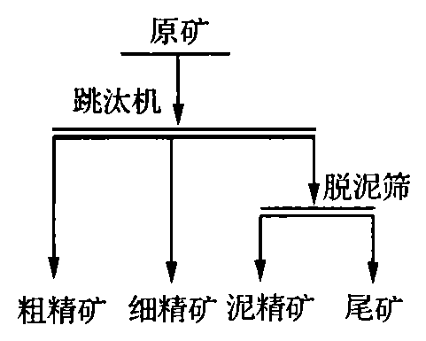 半工業(yè)試驗采用小型鋸齒波跳汰機,篩板面積為0.36m2 。半工業(yè)試驗和實驗室小型試驗流程基本一致,都采用-20mm全粒級入選工藝(見右圖)