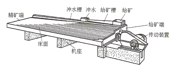 搖床的選礦過程是在具有復(fù)條的傾斜床面上進(jìn)行的,礦粒群從床面上角的給礦槽送入,同時由給水槽供給橫向沖洗水,于是礦粒在重力,橫向流水沖力,床面作往復(fù)不對稱運動所產(chǎn)生的慣性和摩擦力的作用下,按比重和粒度分層,并沿床面作縱向運動和沿傾斜床面作橫向運動。因此,比重和粒度不同的礦粒沿著各自的運動方向逐漸由A邊向B邊呈扇形流下,分別從精礦端和尾礦側(cè)的不同區(qū)排出,最后被分成精礦,中礦和尾礦。